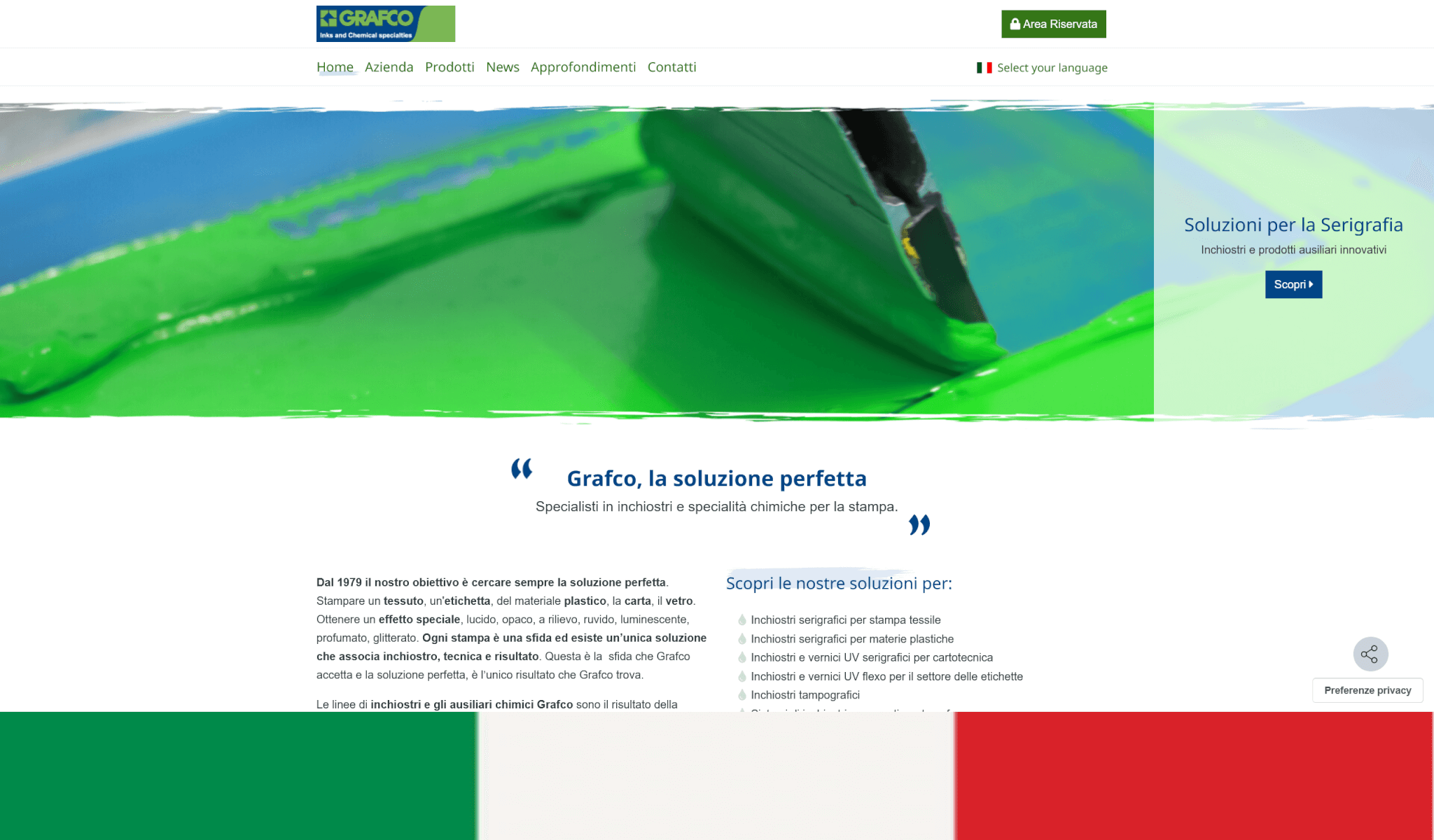 Our inks series and chemical auxiliaries are the result of our research and development division that has been working side by side with printers for 40 years. We pay particular attention in the development of special products on demand and the development of screen printing inks, pad printing inks and flexo printing inks, all formulated and managed according to the sustainability concept.
